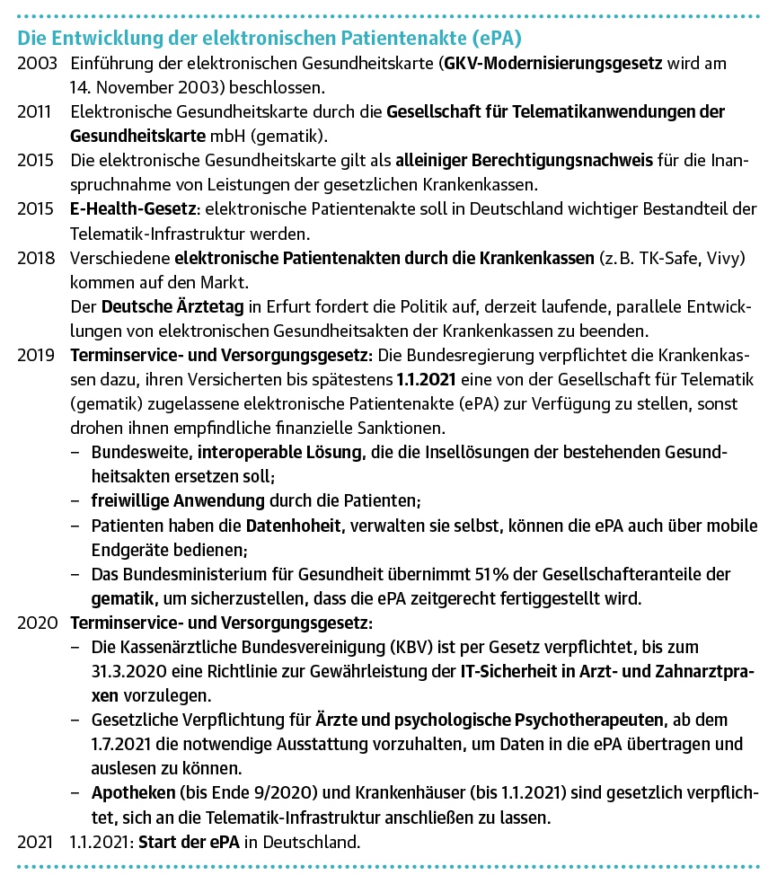 Die elektronische Patientenakte (ePA) soll nach dem mittlerweile in Kraft gesetzten „Terminservice- und Versorgungsgesetz (TSVG)“ von 2019 das zentrale Element der vernetzten Gesundheitsversorgung und der Telematik-Infrastruktur werden. Die gesetzliche Grundlage ist § 291a SGB V, die Rahmenbedingungen der ePA werden durch die gematik definiert. Als Ziel ist von allen an diesem Prozess Beteiligten vorgegeben, eine bundesweit einheitliche und interoperable Lösung für eine ePA zu schaffen, die die Insellösungen der bestehenden Gesundheitsakten ersetzt. Voraussetzung dafür sind bundesweit einheitliche Schnittstellen (z. B. zu den unterschiedlichen Praxisverwaltungssystemen, PVS), die von der gematik spezifiziert werden. Die Kassenärztliche Bundesvereinigung (KBV) hat vom Gesetzgeber die Aufgabe erhalten, die medizinischen Daten für die ePA zu standardisieren. Unter der Bezeichnung „Medizinische Informationsobjekte“ (MIOs) muss die KBV bis Herbst 2020 erste Standards definieren, z. B. für Labordaten, bestimmte medizinische Befunde oder den Impfpass.